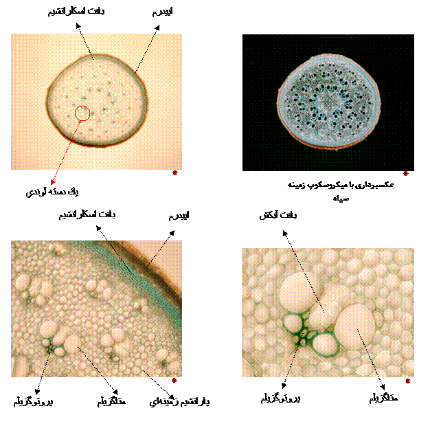 مارچوبه ( Asparagus ) عليرغم اينكه گياه آسپاراگوس كمتر در كتابها و رسالهها مورد بررسي قرار ميگيرد اما خصوصيات مشابه زيادي با ذرت و نيشكر دارد . در اين گياه ساقه توسط اپيدرم كه داراي كوتيكول ضخيم و روزنه ميباشد پوشيده شده است . لايه خارجي ساقه اين گياه داراي دستجات آوندي ظريف و كوچكي است كه با بافت كلرانشيم ( پارانشيم فتوسنتزي ) احاطه شده است . بدنبال آن ديواره ضخيمي از سلولهاي اسكلرانشيمي ظاهر ميگردد . هرچه به سمت مركز ساقه ميرويم ، دستجات آوندي بزرگتر ميشوند . در يك دسته آوندي بافت آبكش توسط بافت چوب به شكل U احاطه شده است . اطراف يك دسته آوندي بافت اسكلرانشيم وجود ندارد لذا فاقد غلاف آوندي ميباشد . |